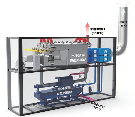 5001拉斯維加斯超級燃氣熱水鍋爐主要由燃氣微壓相變熱水鍋爐、燃氣溴化鋰吸收式熱泵、節能器、冷凝器及消白再熱器組成,即鍋爐-熱泵-消白一體機。 鍋爐與熱泵均采用5001拉斯維加斯發明專利水冷預混燃燒技術(專利號:ZL 2014 1 0506486.6),鍋爐排煙經過節能器被采暖回水冷卻降溫,再經過熱泵冷凝器冷卻降溫到30℃以下,釋放出大量煙氣冷凝器,再經過消白再熱器加溫至不飽和狀態排出。采暖回水經由熱泵、節能器加熱后再進相變鍋爐換熱器加溫,對外輸出供熱。